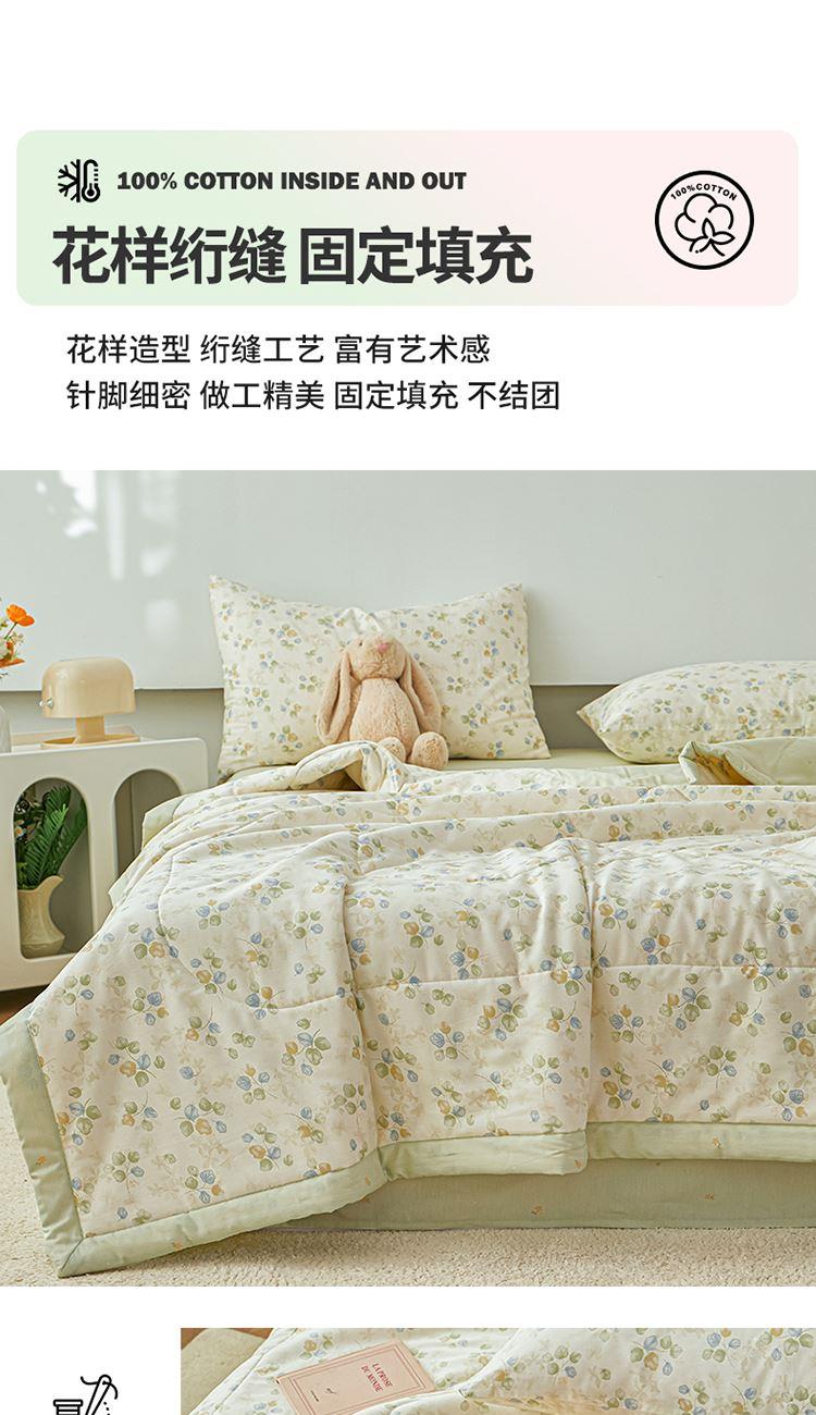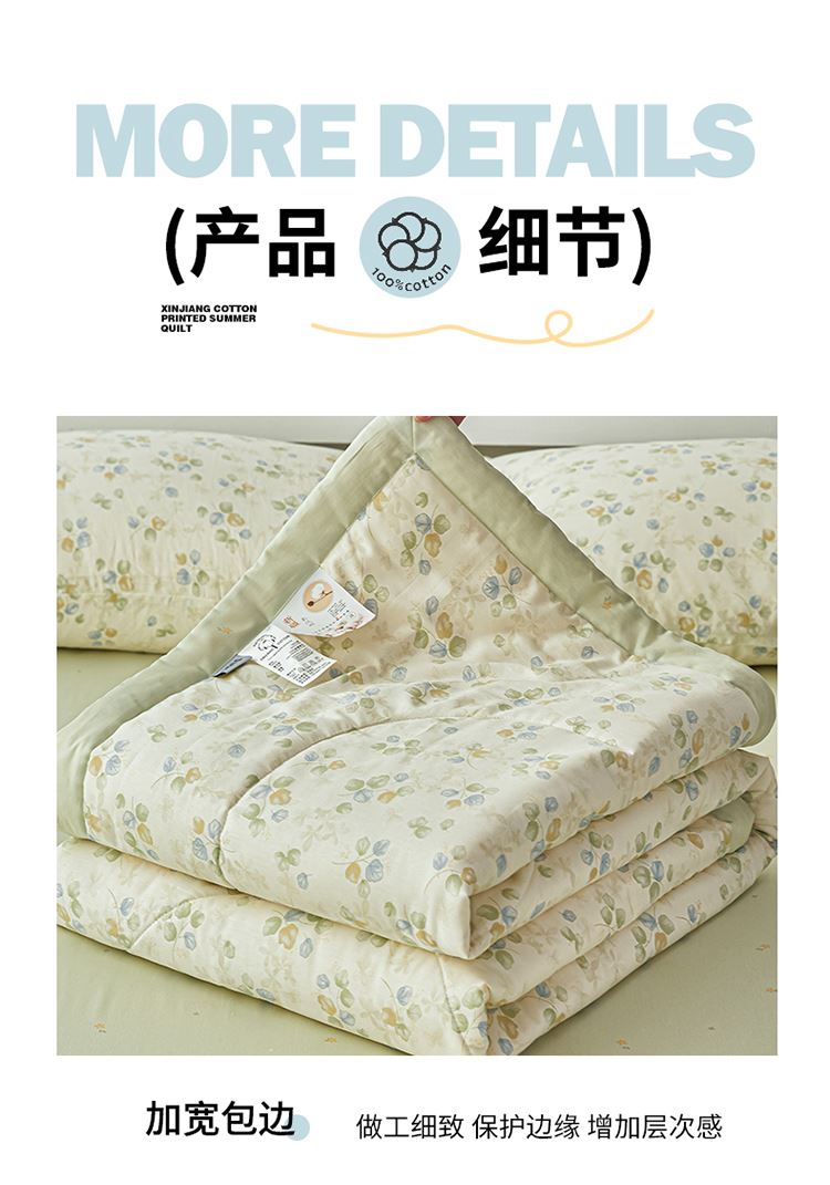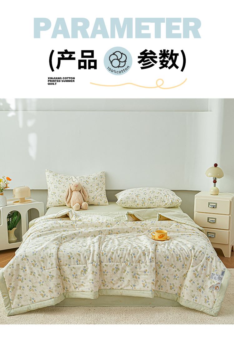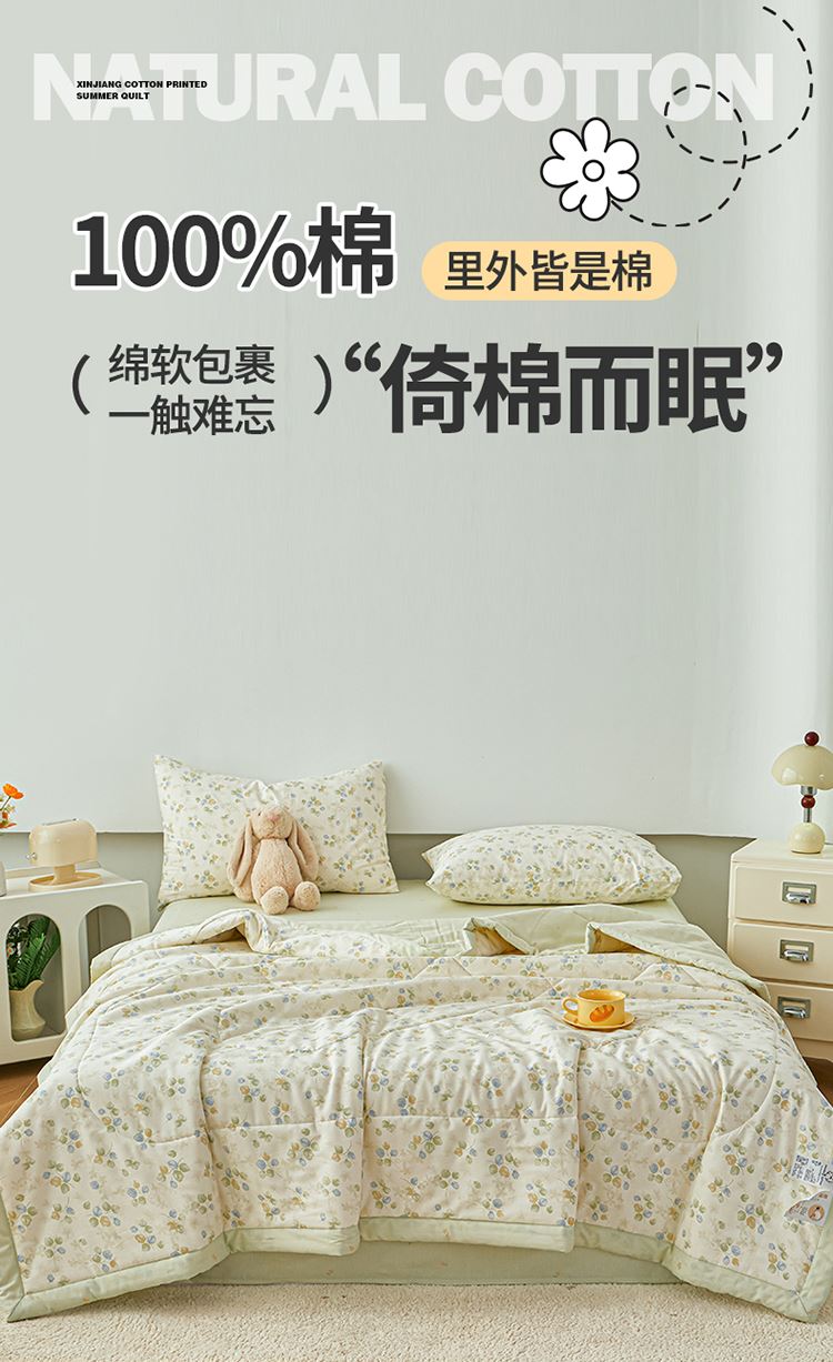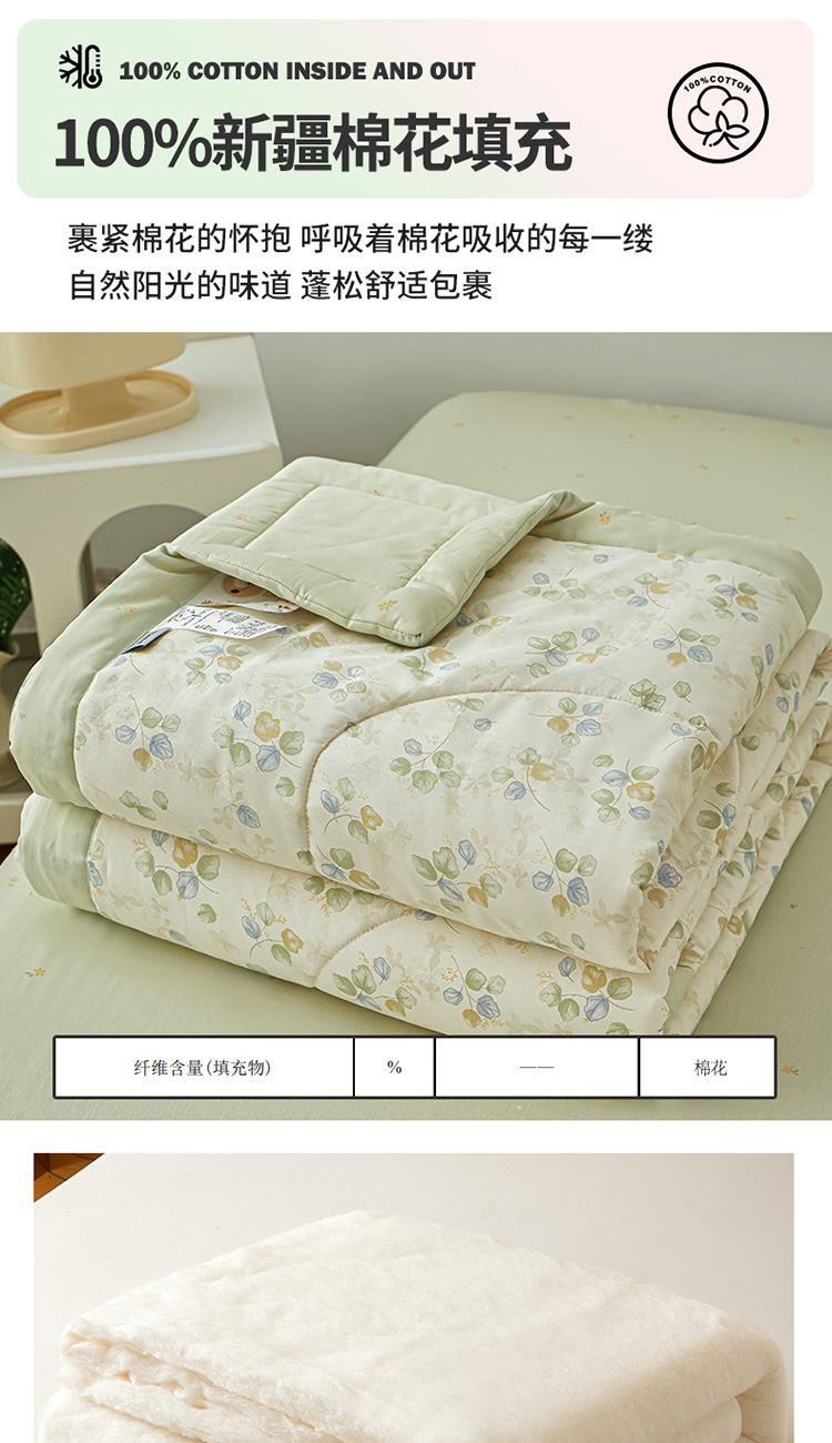 亲肤面料 | 采用亲肤的材质,柔软触感,手感舒适,不易气球,耐磨性好。 活性印染 | 新一代印染工艺,色牢度高,不易褪色,色彩靓丽。 面料: 全棉 填充: 棉花 尺寸:150*200cm