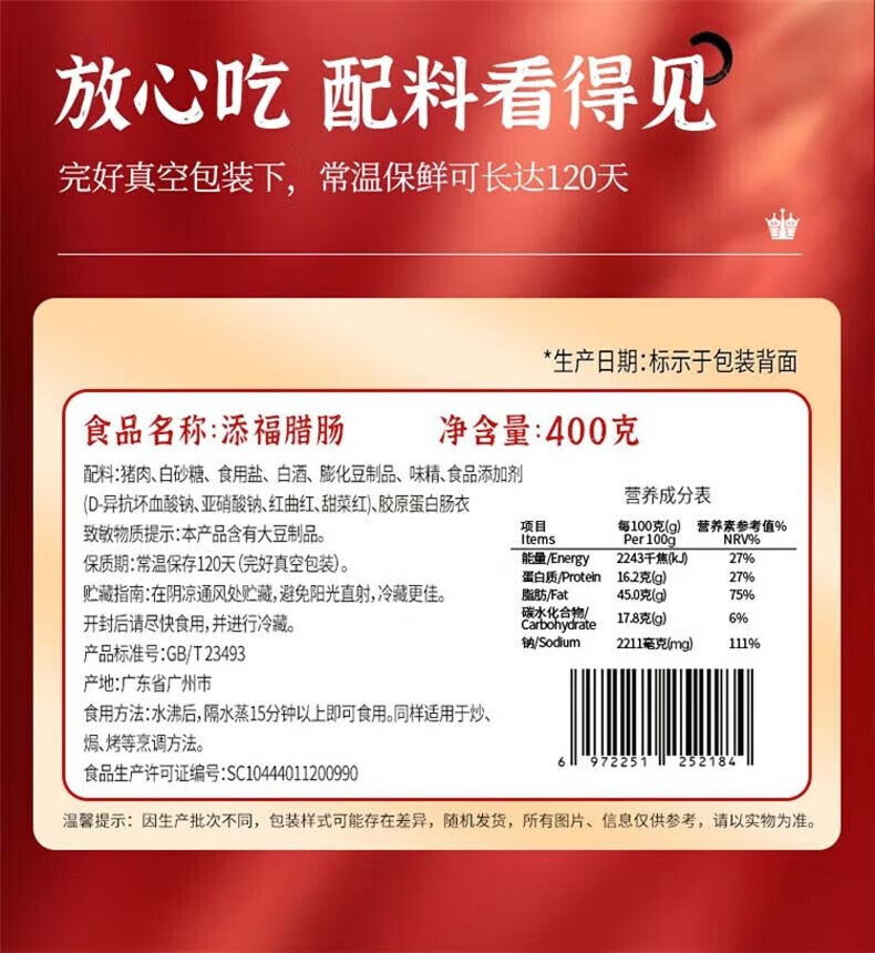 保质期:160天 产地:广东 特产品类:广式腊肠 贮存条件:常温 食用方法:烹饪食用 加工工艺:烘干 包装形式:袋装