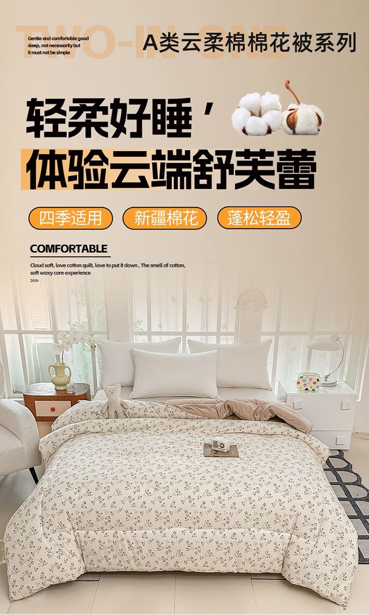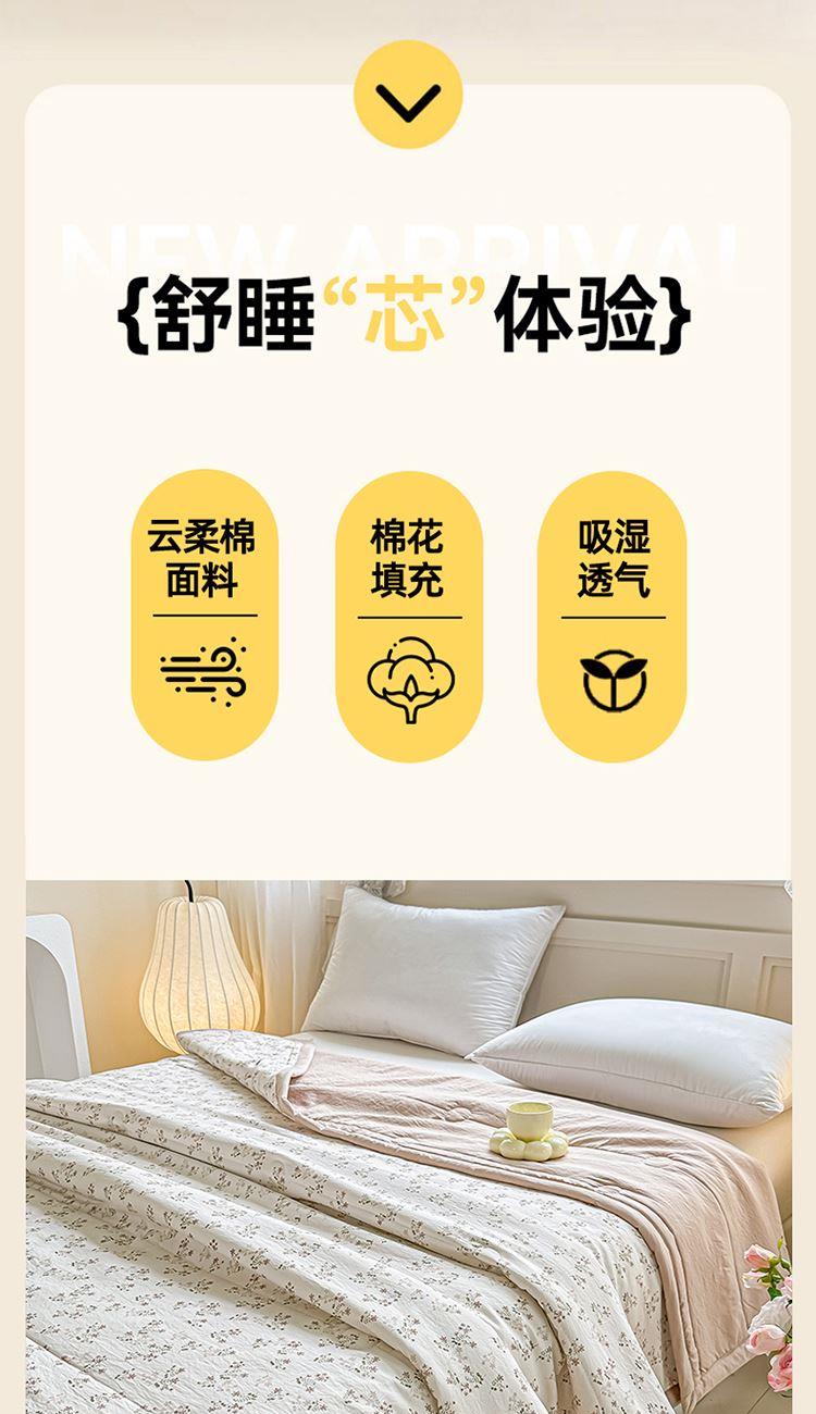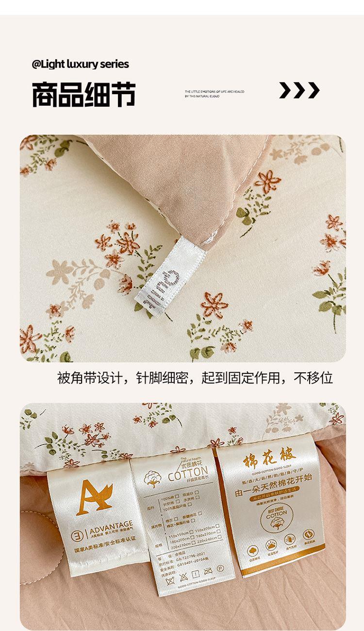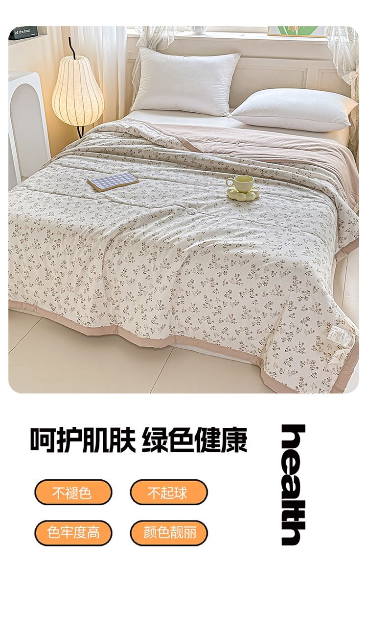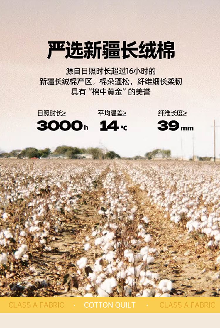 亲肤面料 | 采用亲肤的材质,柔软触感,手感舒适,不易气球,耐磨性好。 活性印染 | 新一代印染工艺,色牢度高,不易褪色,色彩靓丽。 面料:云柔棉 填充:51%新疆棉花+49%羽丝棉 尺寸:150*200cm