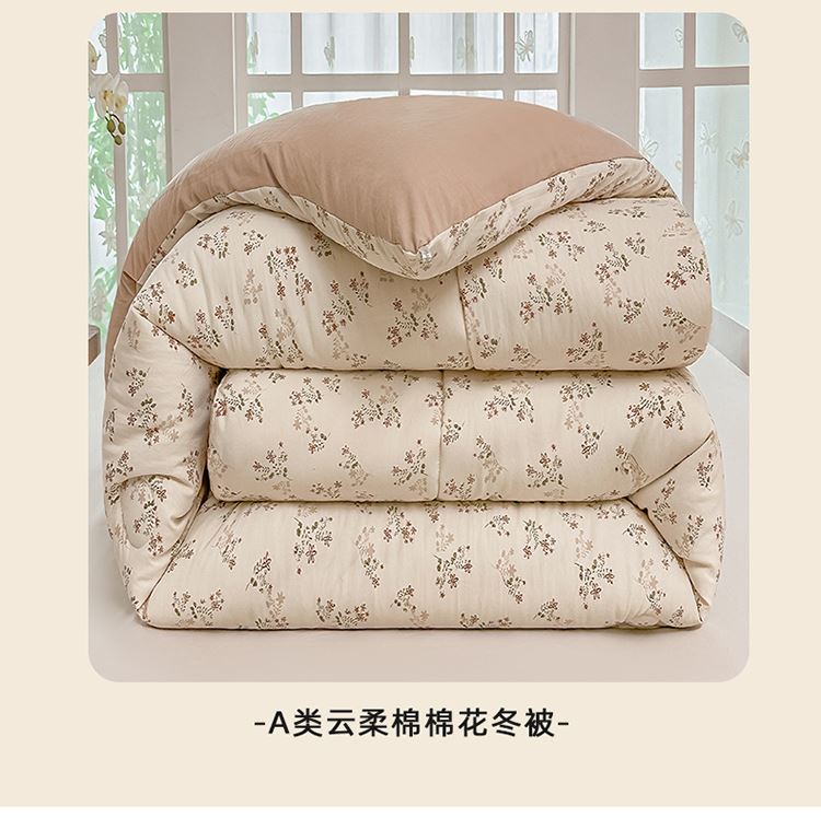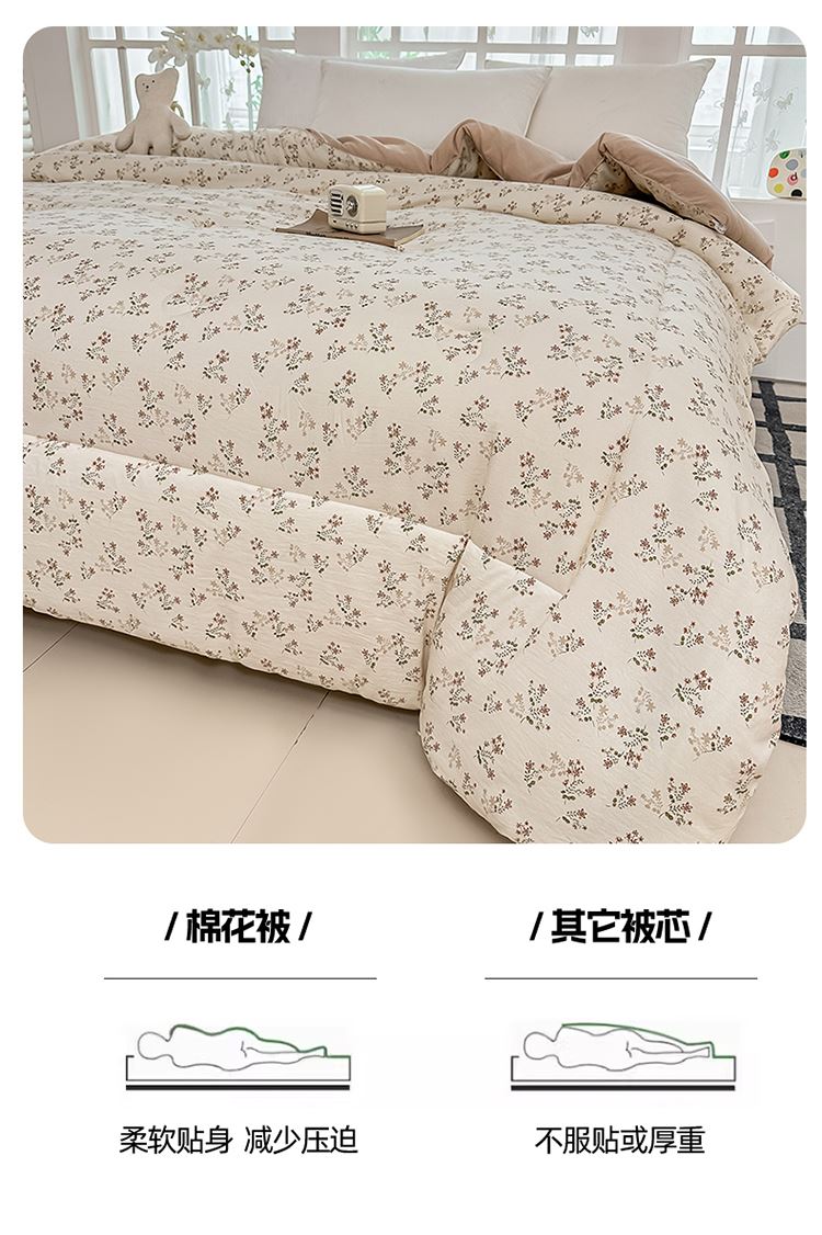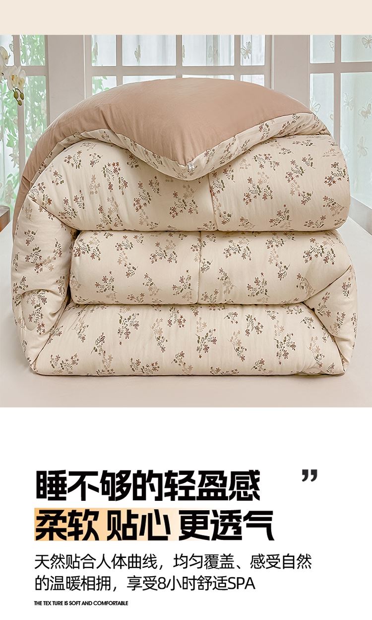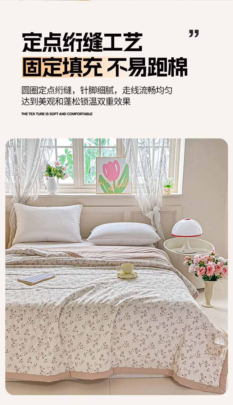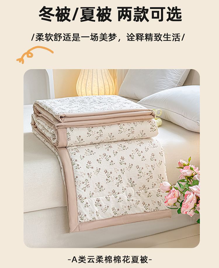 亲肤面料 | 采用亲肤的材质,柔软触感,手感舒适,不易气球,耐磨性好。 活性印染 | 新一代印染工艺,色牢度高,不易褪色,色彩靓丽。 面料:云柔棉 填充:51%新疆棉花+49%羽丝棉 尺寸:150*200cm