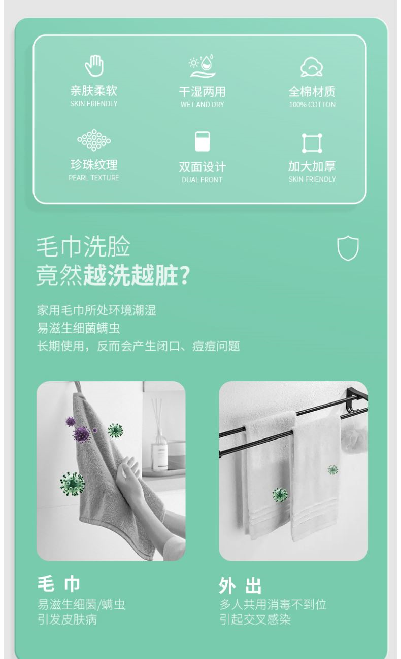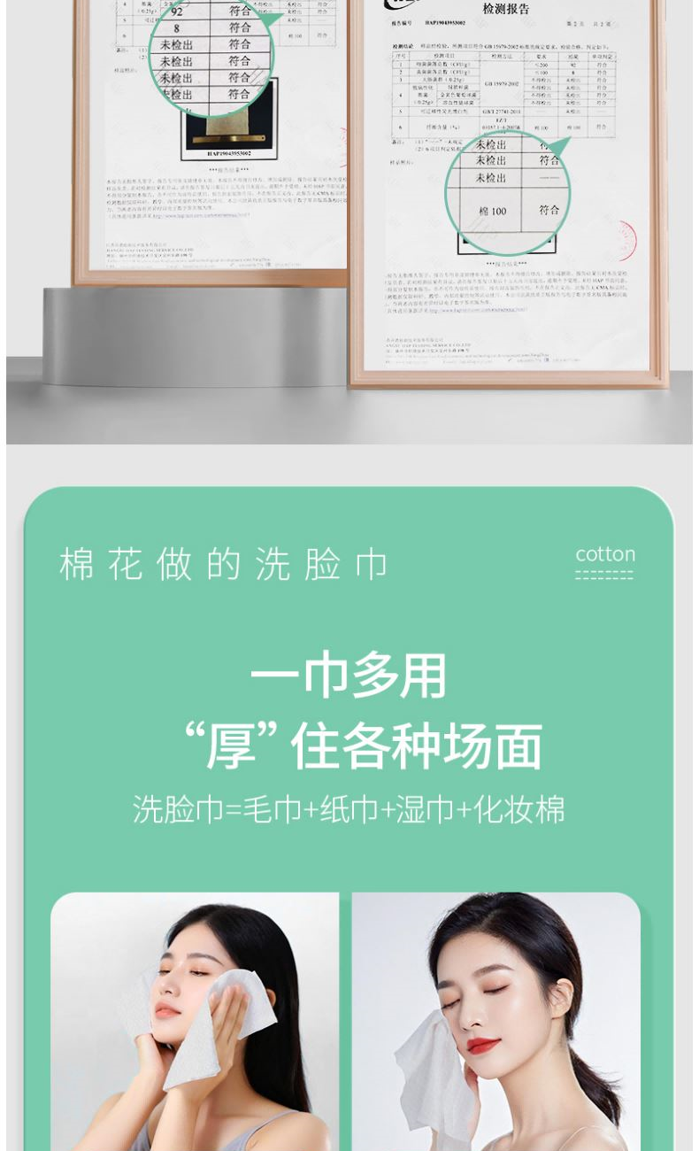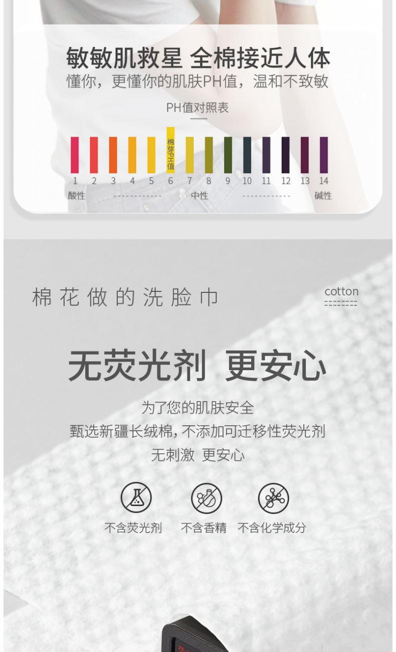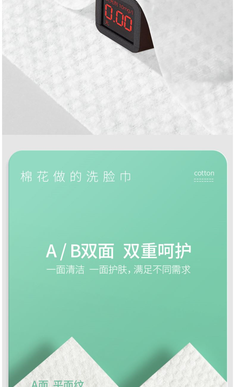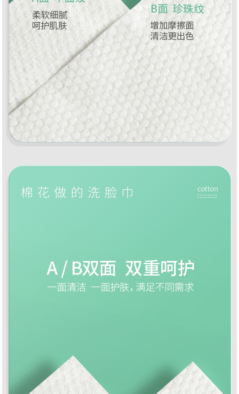 材 质:纯棉 尺 寸:20X20cm 净 含 量:168抽/提*1提 克 重:70g 核心利益点: 1、纯棉,无添加,不易掉毛,不易掉絮。 2、加大加厚(对比市场纯棉珍珠纹款)。 产品区隔点 : 双面纹理,悬挂式省空间家庭装。