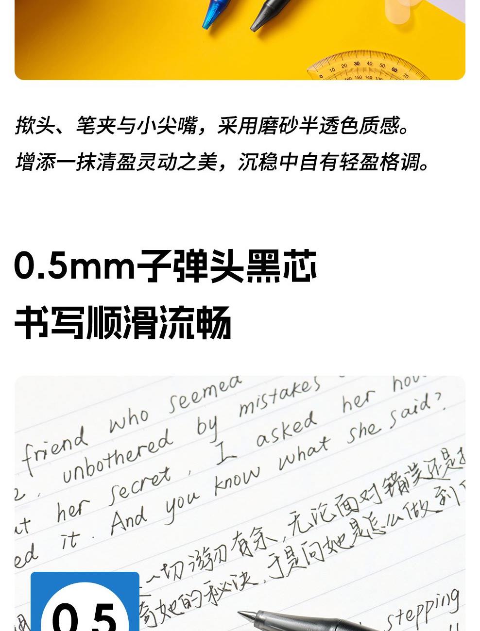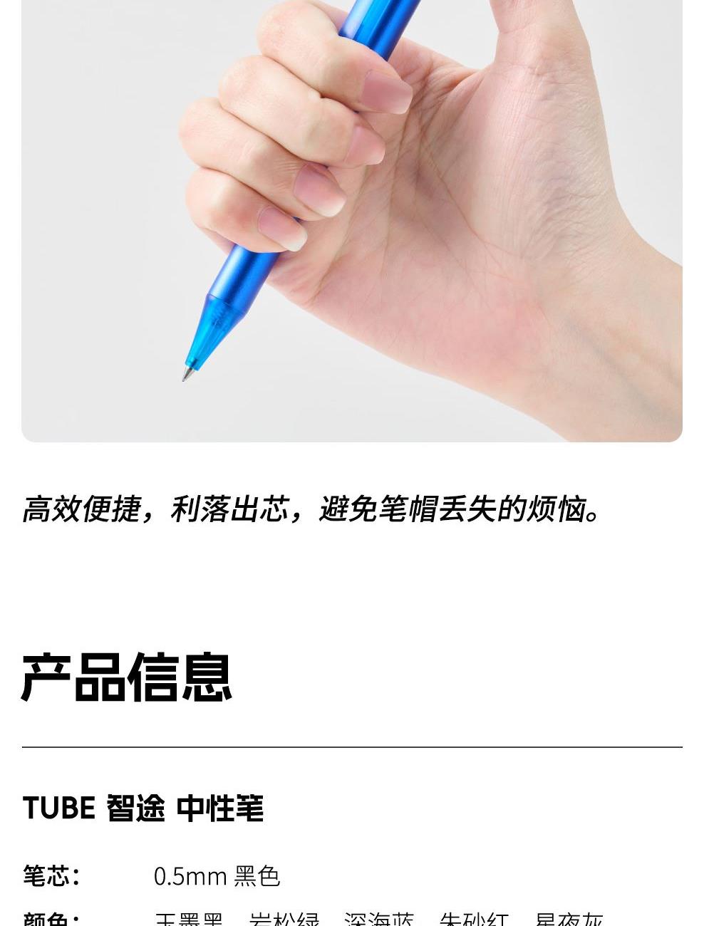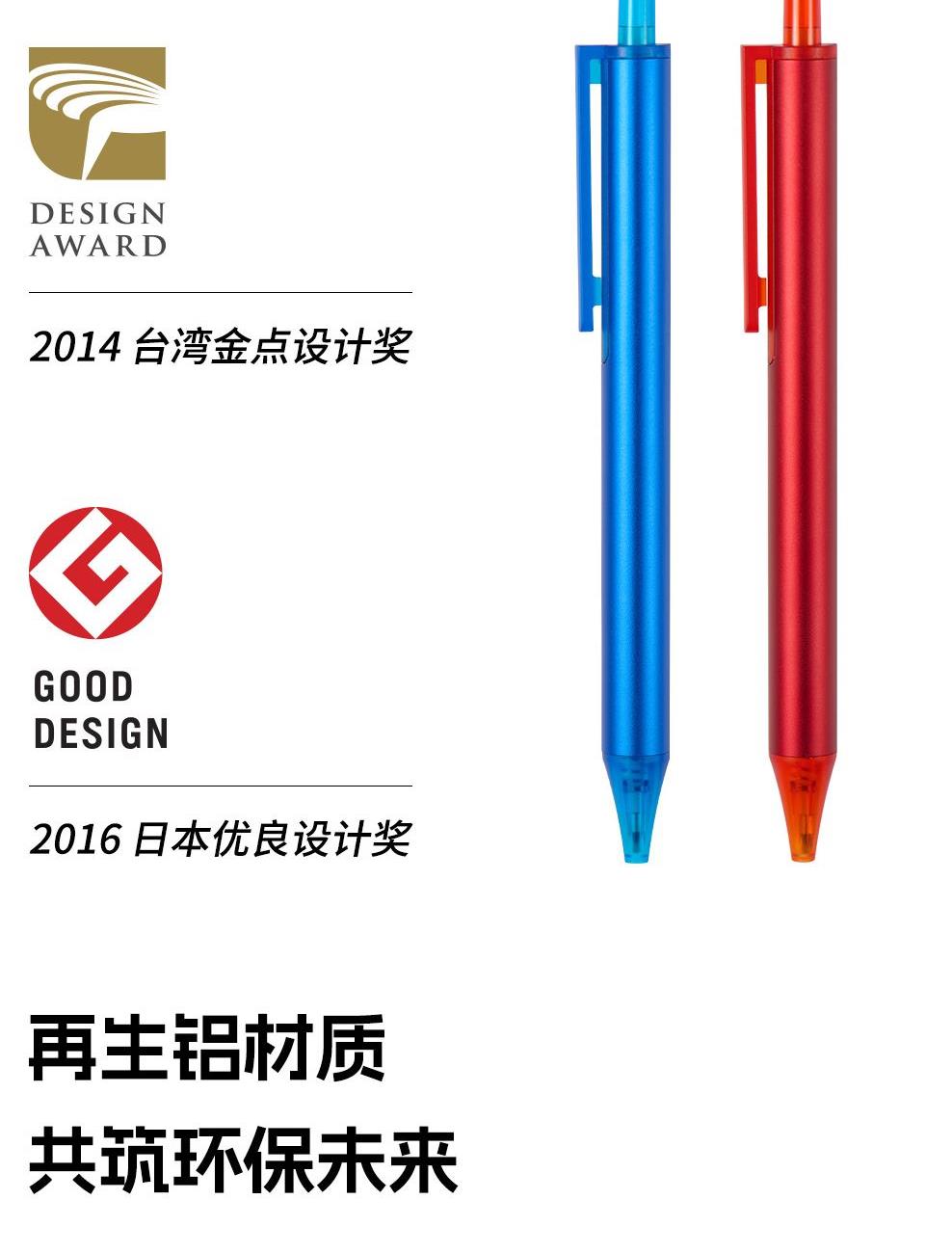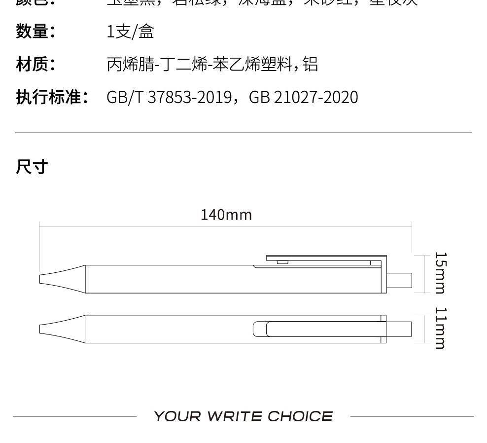 尺 寸:137.5*10.3mm 材 质:铝合金,丙烯腈-丁二烯-苯乙烯塑料 外观颜色:星夜灰/岩松绿/朱砂红/深海蓝/玉墨黑 1、磨砂笔身,提升气质格调,再生铝材质,助力环保。 2、揿头/笔夹/小尖嘴采用磨砂半透色质感,灵动轻奢。 定制工艺:笔身激光Logo 打样周期:3-5天 货 期:7-10天发货(不含重大法定假日) 包装方式:单支OPP袋