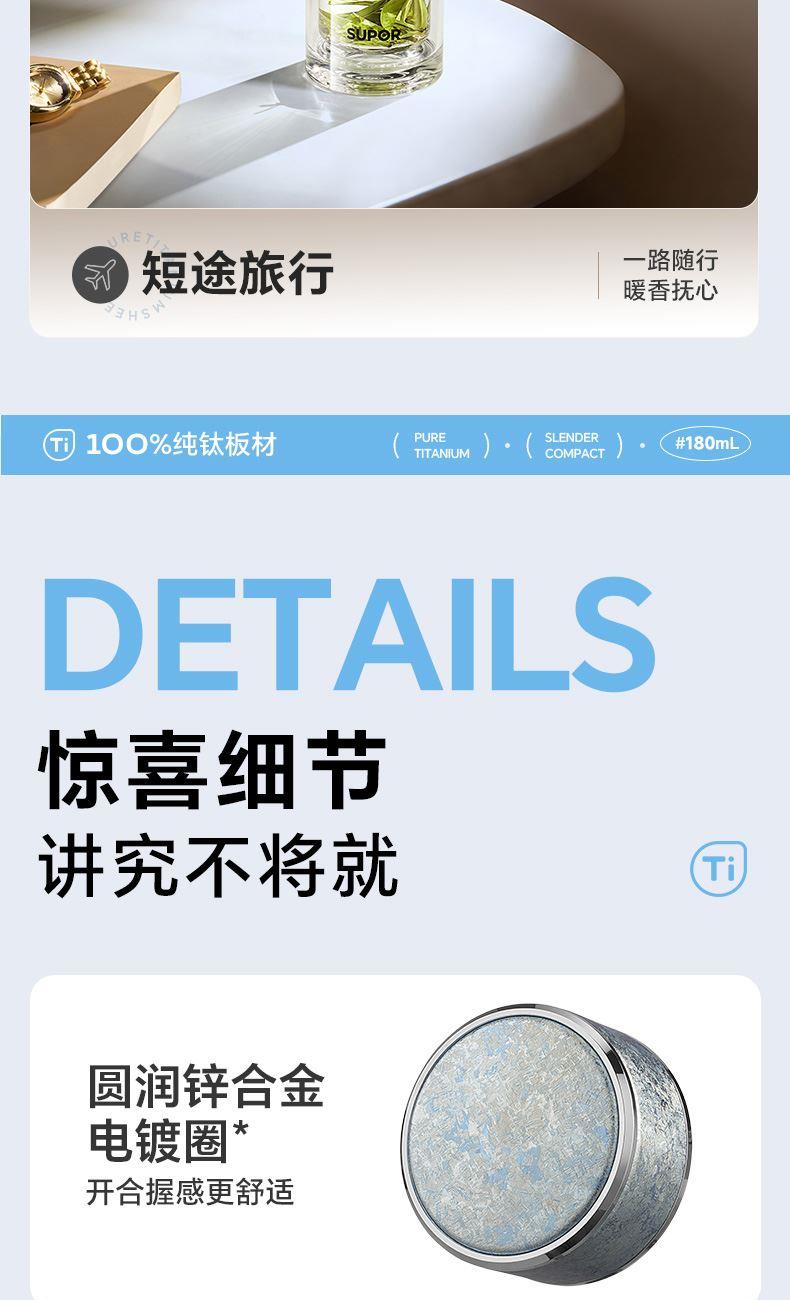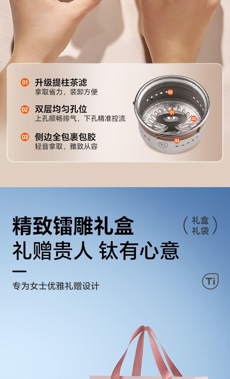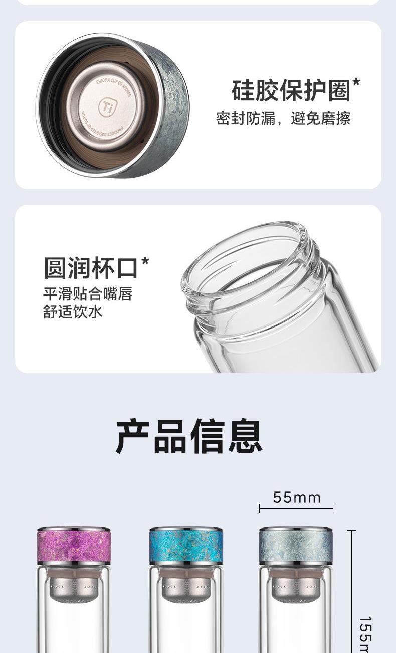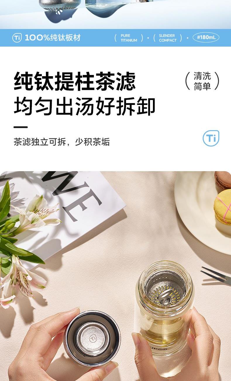 容量:180ml 518*249*406mm 11.60kgs 材质:纯钛+高硼硅 卖点: 1.加厚防爆杯体外层加厚底 2.耐冷热杯体4小时退火工艺