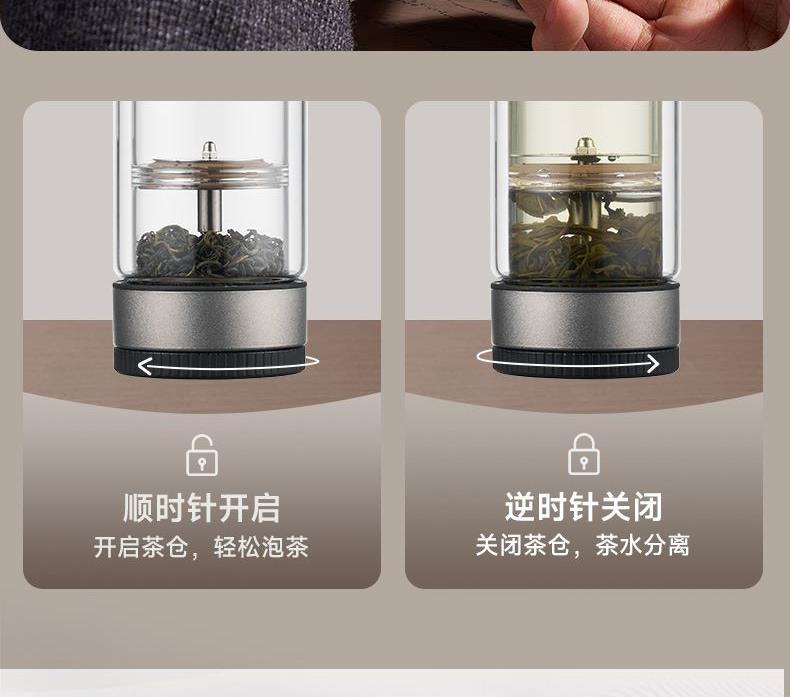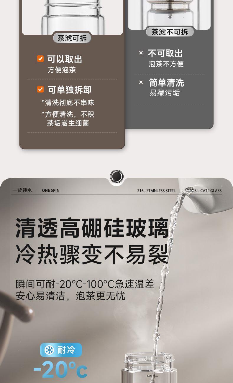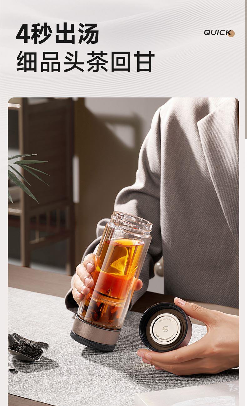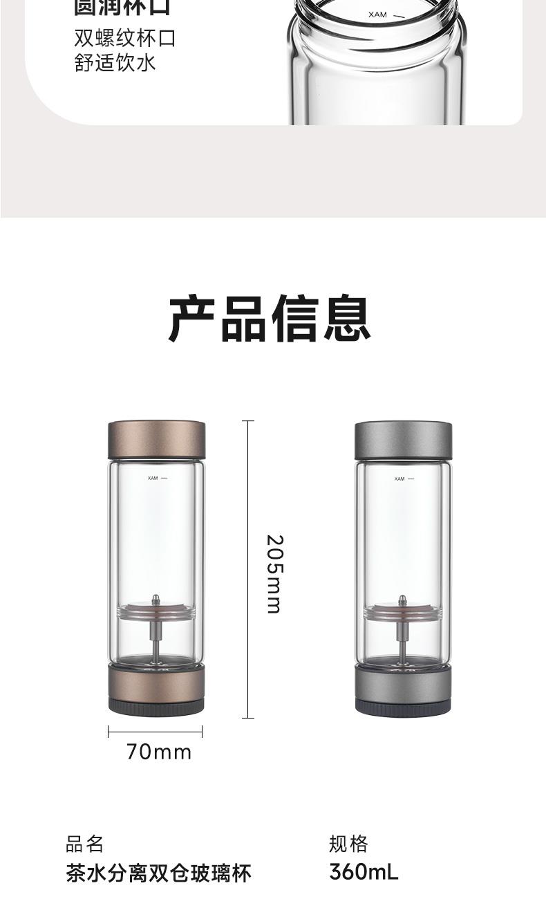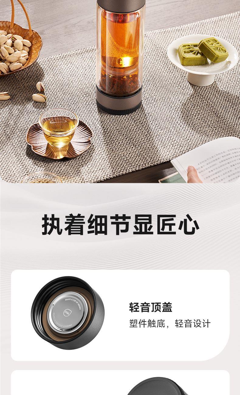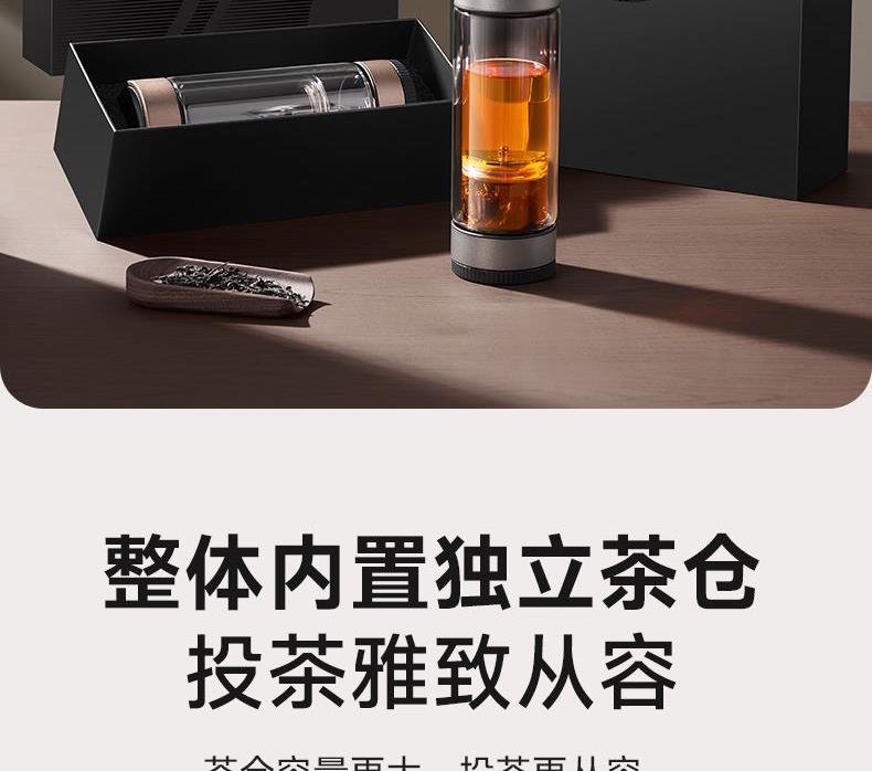 容量:360ml 578*463*268mm 15.80kgs 材质:316不锈钢+高硼硅 卖点: 1.双仓设计,一旋茶水分离 2.茶滤可拆易清洁 3.4秒极速出水,好茶不用等 4.底盖设计:耐脏易清洁 5.顶盖设计:塑件触底,轻音设计