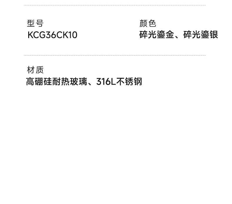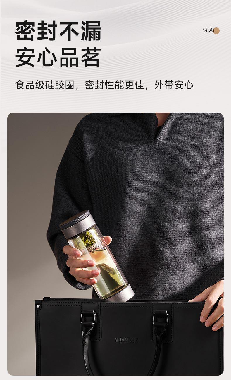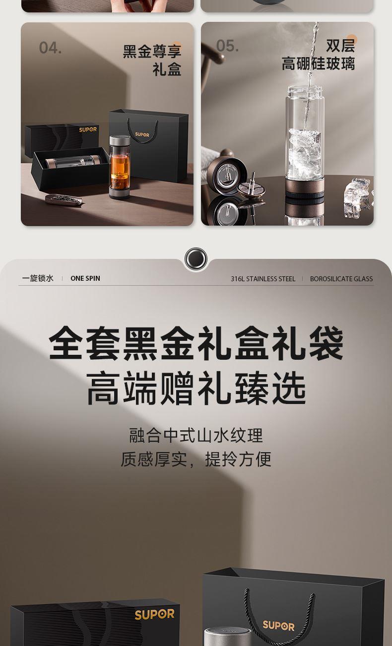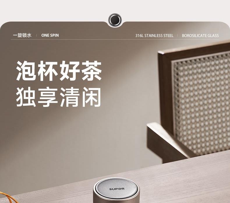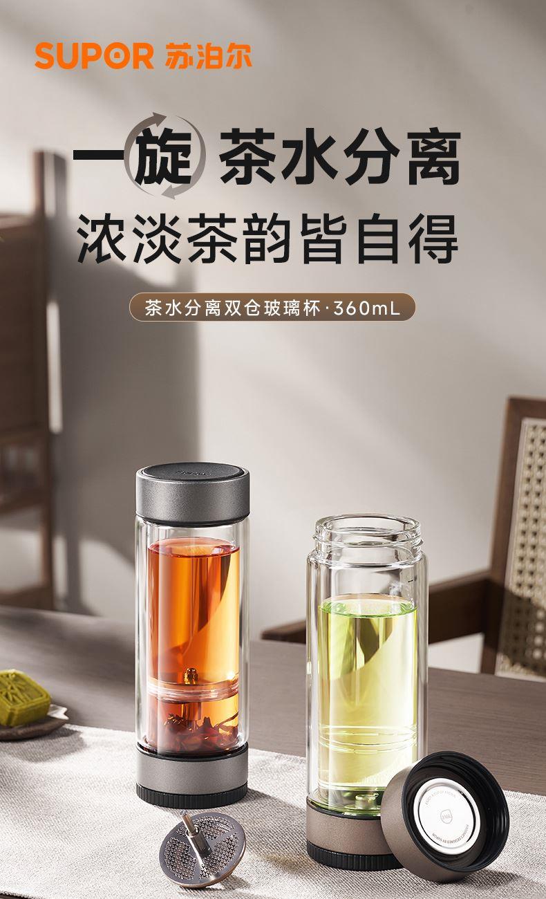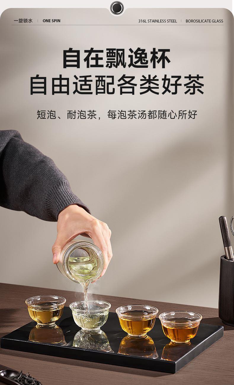 容量:360ml 578*463*268mm 15.80kgs 材质:316不锈钢+高硼硅 卖点: 1.双仓设计,一旋茶水分离 2.茶滤可拆易清洁 3.4秒极速出水,好茶不用等 4.底盖设计:耐脏易清洁 5.顶盖设计:塑件触底,轻音设计