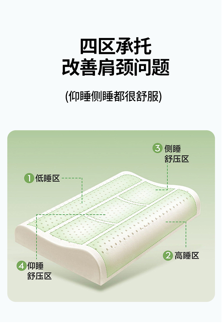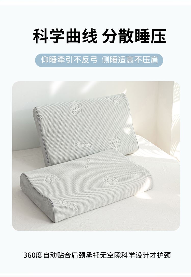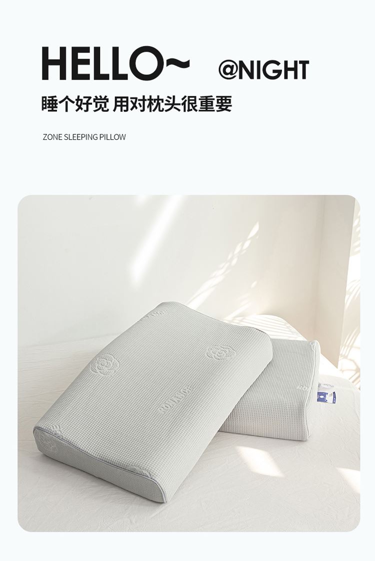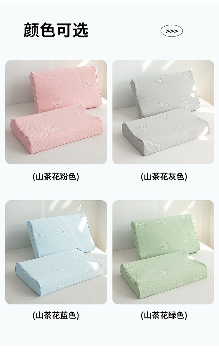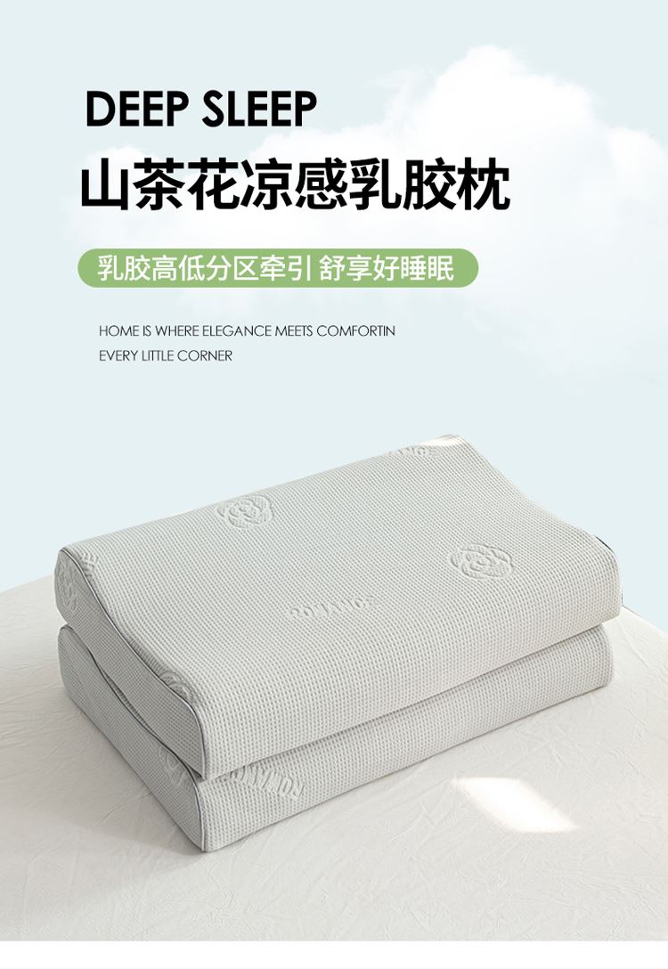 1:山茶花凉感乳胶枕 乳胶高低分区牵引舒享好睡眠 2:四区承托改善肩颈问题 (仰睡侧睡都很舒服) 3:科学曲线分散睡压 仰睡牵引不反弓 侧睡适高不压肩 面料:凉感冰丝 填充:乳胶 尺寸:40*60*10/12cm 包装:彩盒