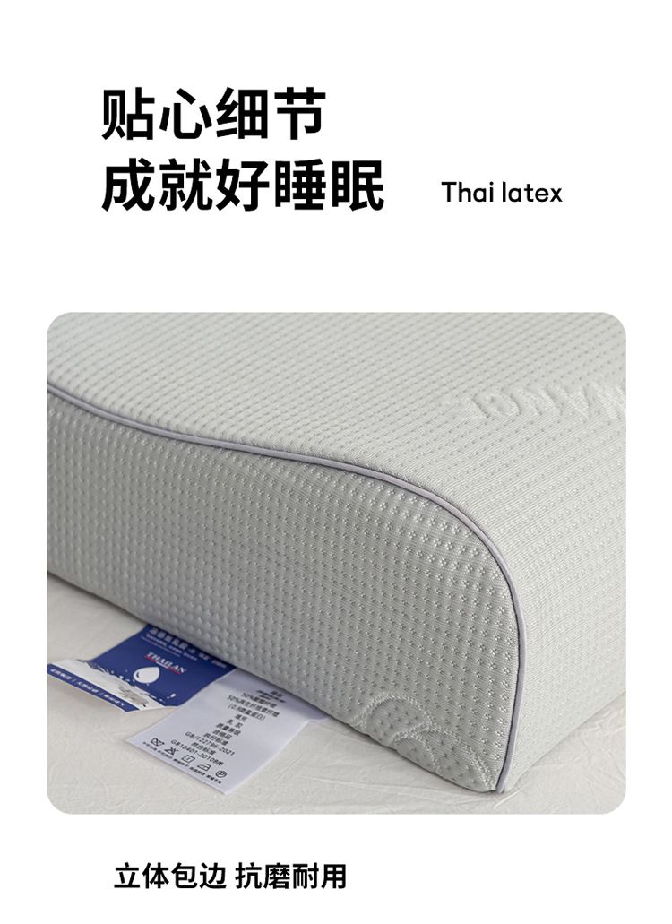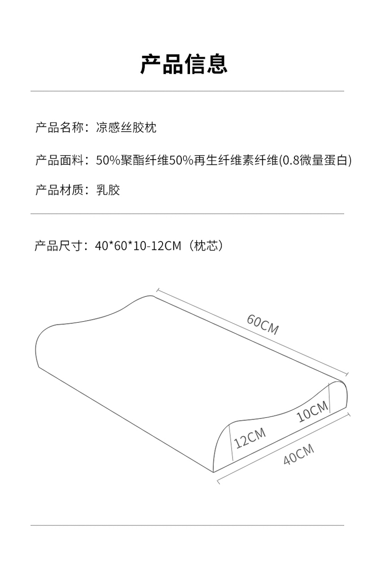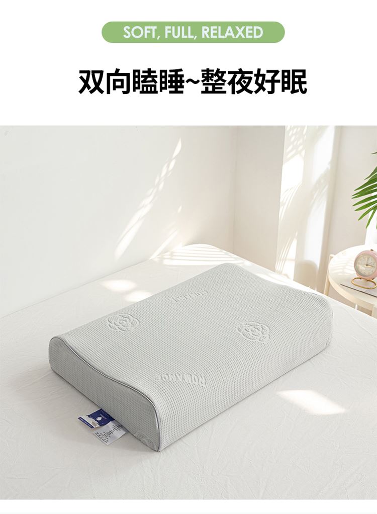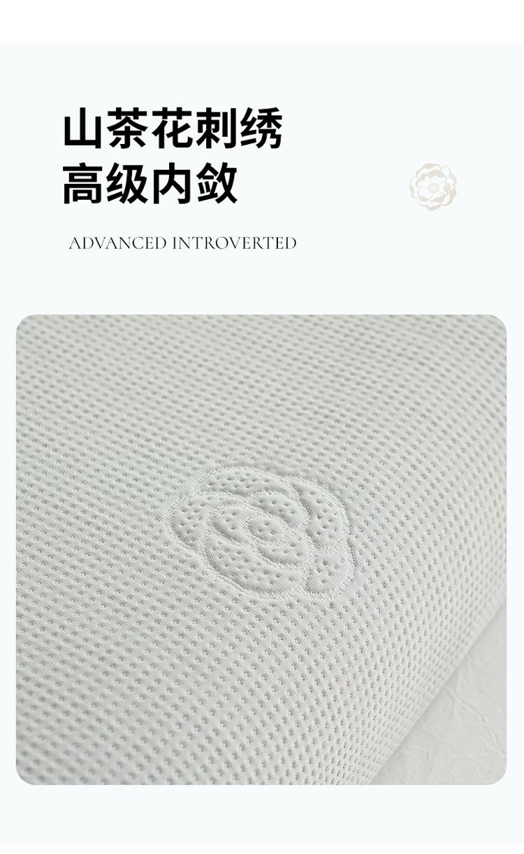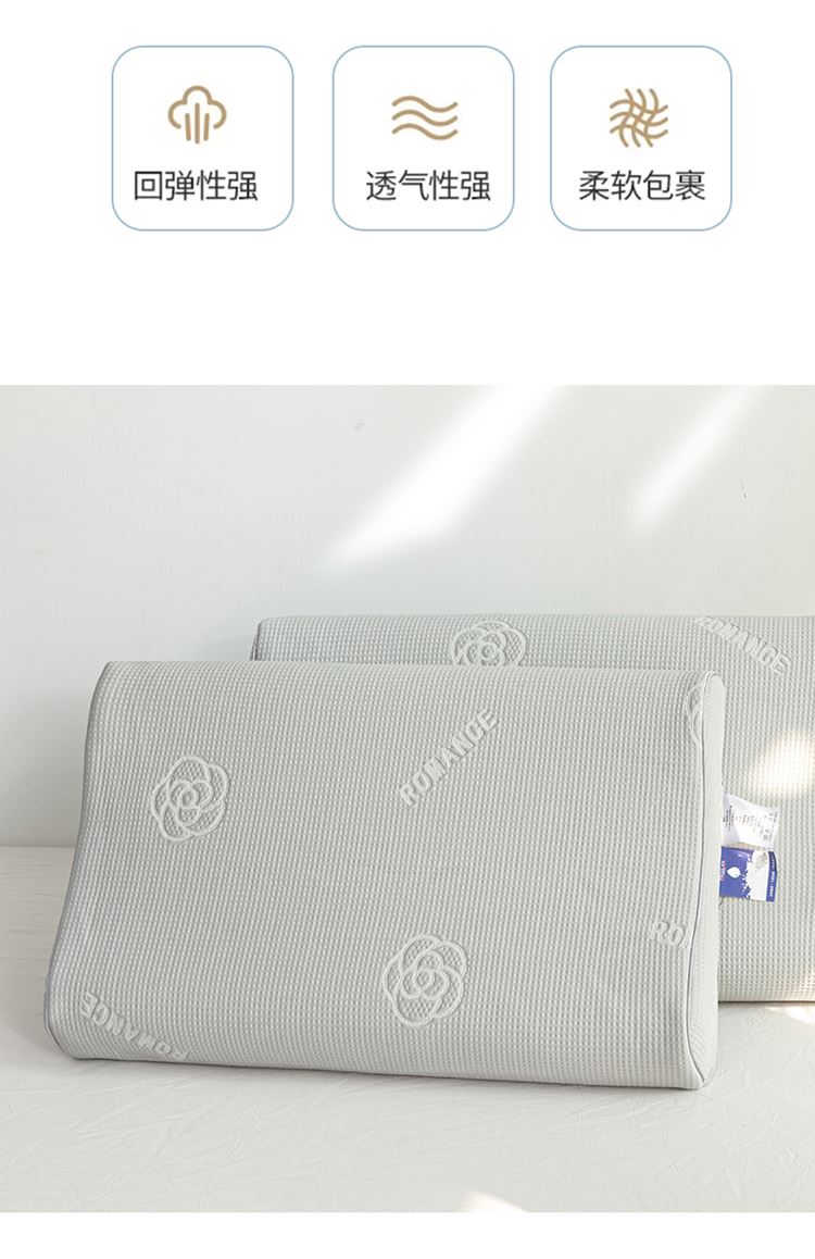 1:山茶花凉感乳胶枕 乳胶高低分区牵引舒享好睡眠 2:四区承托改善肩颈问题 (仰睡侧睡都很舒服) 3:科学曲线分散睡压 仰睡牵引不反弓 侧睡适高不压肩 面料:凉感冰丝 填充:乳胶 尺寸:40*60*10/12cm 包装:彩盒
