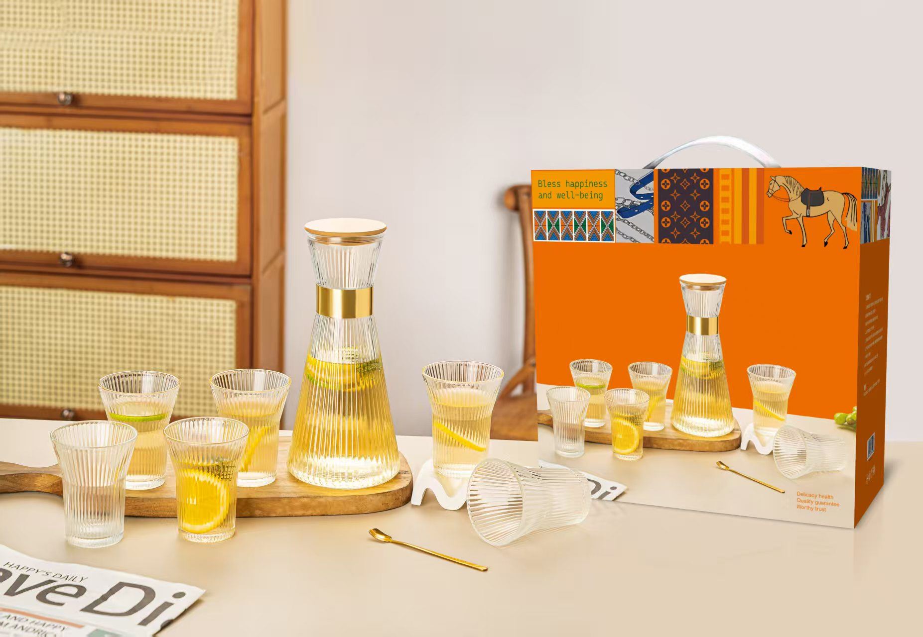 货号:AIZLV126 材质:玻璃 配置:1壶+6杯 条码:697449275126 彩盒尺寸:25.1*15*25.1cm 全新的设计造型,精品质量,安全、健康、卫生,外观新颖,颜值大气,包装安全,性价比高,是促销、商务、会议和福利礼品。