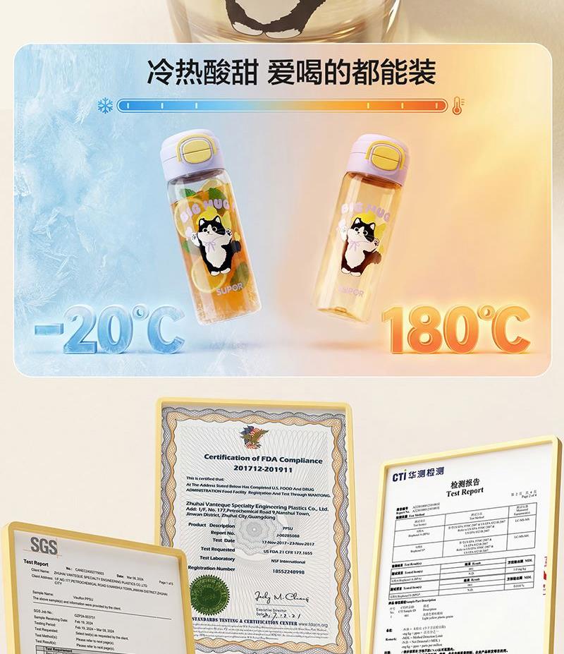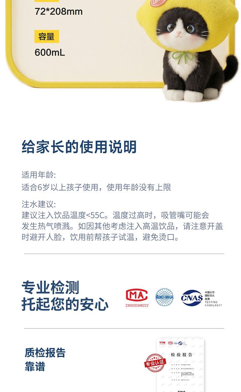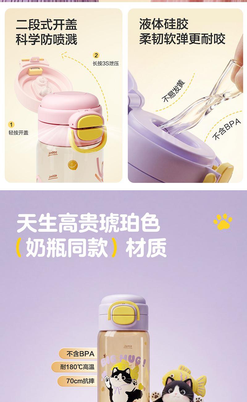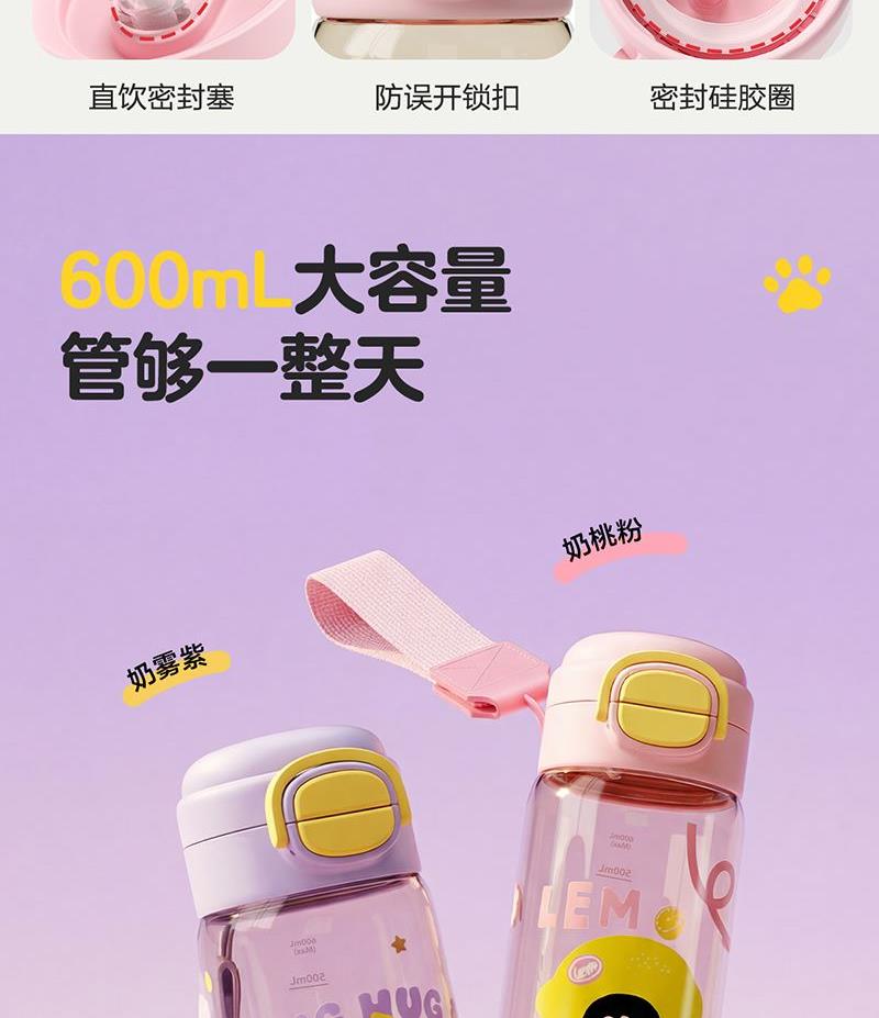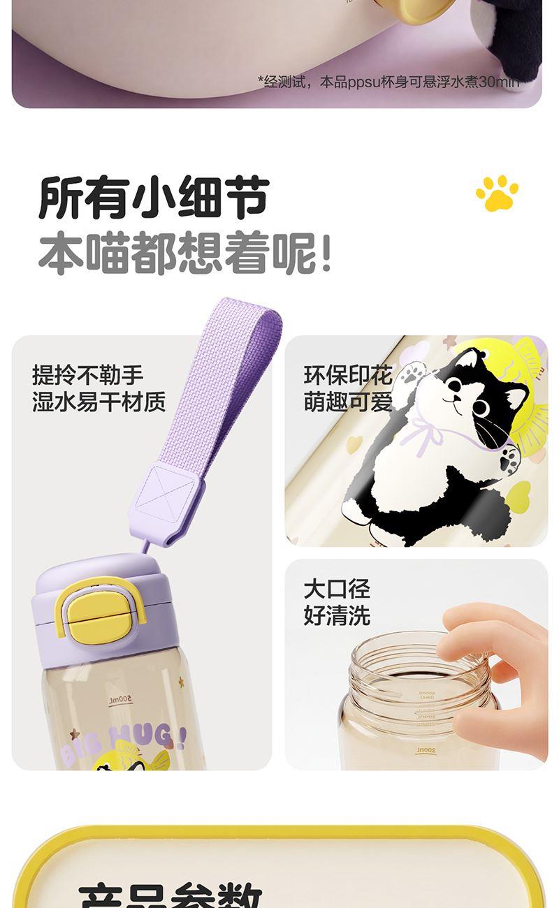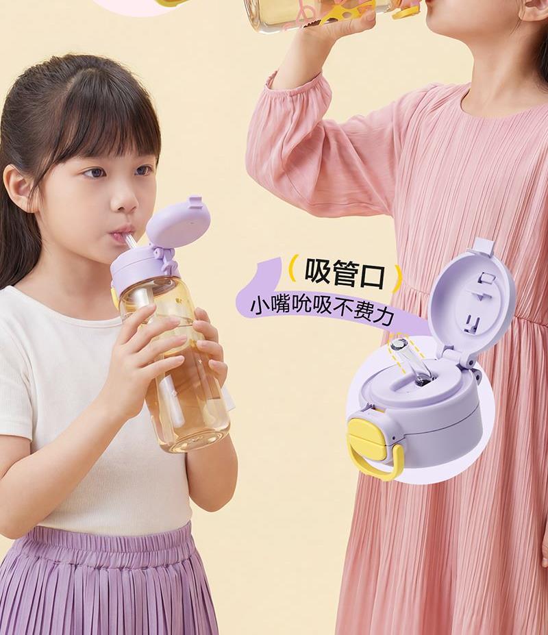 容量:600ml 524*515*229mm 9.9kgs 材质:PPSU 卖点: 1.一盖双饮模式,满足不同饮水需求 2.二段泄压设计,弹盖防喷溅更安全 3.72mm直径,轻松放进书包侧袋 4.自带提绳方便提拎 5.600mL容量,满足小朋友一天所需