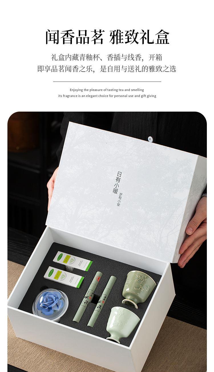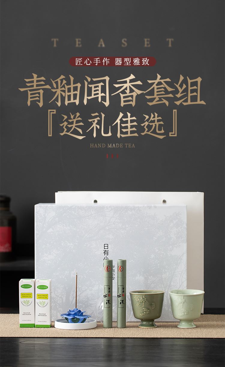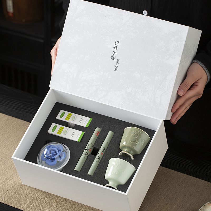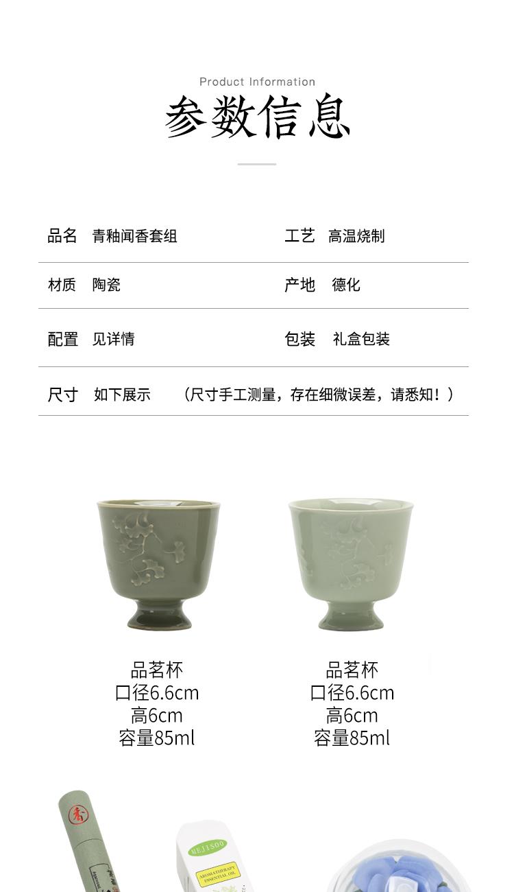 配置:主人杯*2 陶瓷花*1 香薰*2 线香*2 礼盒*1 手提袋*1 材质:青瓷 礼盒尺寸:29cm*21cm*12cm 产品尺寸:银杏杯:直径6.7cm,高6.2cm,容量90ml,