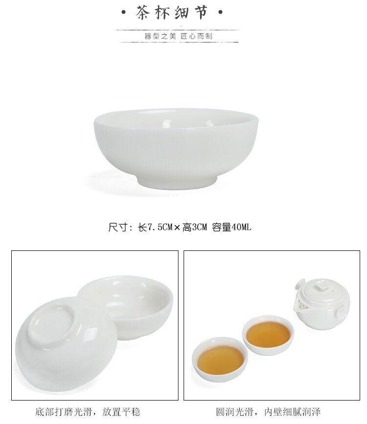 配制:1壶2杯 1旅行袋 1茶巾 规格:茶壶:直径9.5*H7cm 杯子:直径7.5*H3c 材质:羊脂玉瓷 推荐说明:两个杯子可与壶上下重叠组合。方便携带,简单实用。高雅时尚。简洁大方。羊脂玉瓷,瓷质细腻温润,触感舒适。似凝脂,如美玉。在阳光照射下,呈半透明羊油状,洁白滋润,故称羊脂玉,乃瓷中佳品。塑压布包,时尚精致上档次。