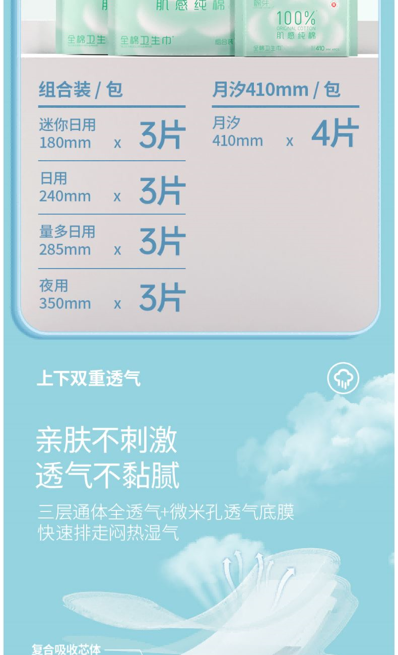 净含量:4片/包*1包 材质:全棉无纺布、高分子吸水树脂、透气底膜、热熔胶 核心利益点: 不闷 超薄芯体 不漏 瞬吸锁水 不刺激 纯棉
